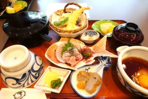 お昼は,古関先生と大西先生と一緒に山上会館地下のかどや山上亭で宇和島鯛めし豪華膳を頂きました。とても美味しく頂きました。