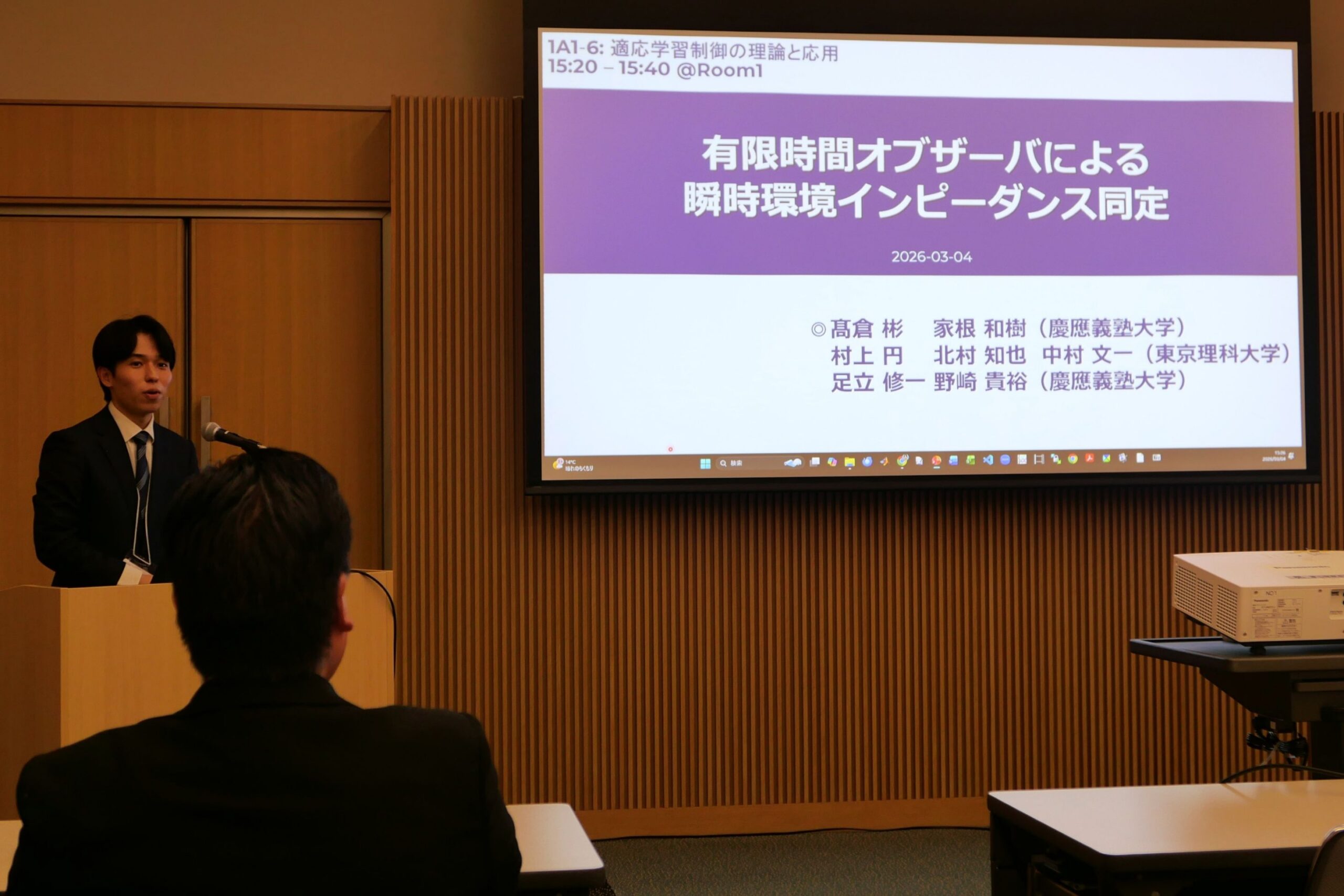 ・ 3/4に「有限時間オブザーバによる瞬時環境インピーダンス同定」という題目で,髙倉彬君(慶大 野崎研)が発表しました。連名は,家根和樹(慶大),村上 円(東京理科大),北村知也(東京理科大),中村文一(東京理科大),足立修一(慶大),野崎貴裕(慶大)です。