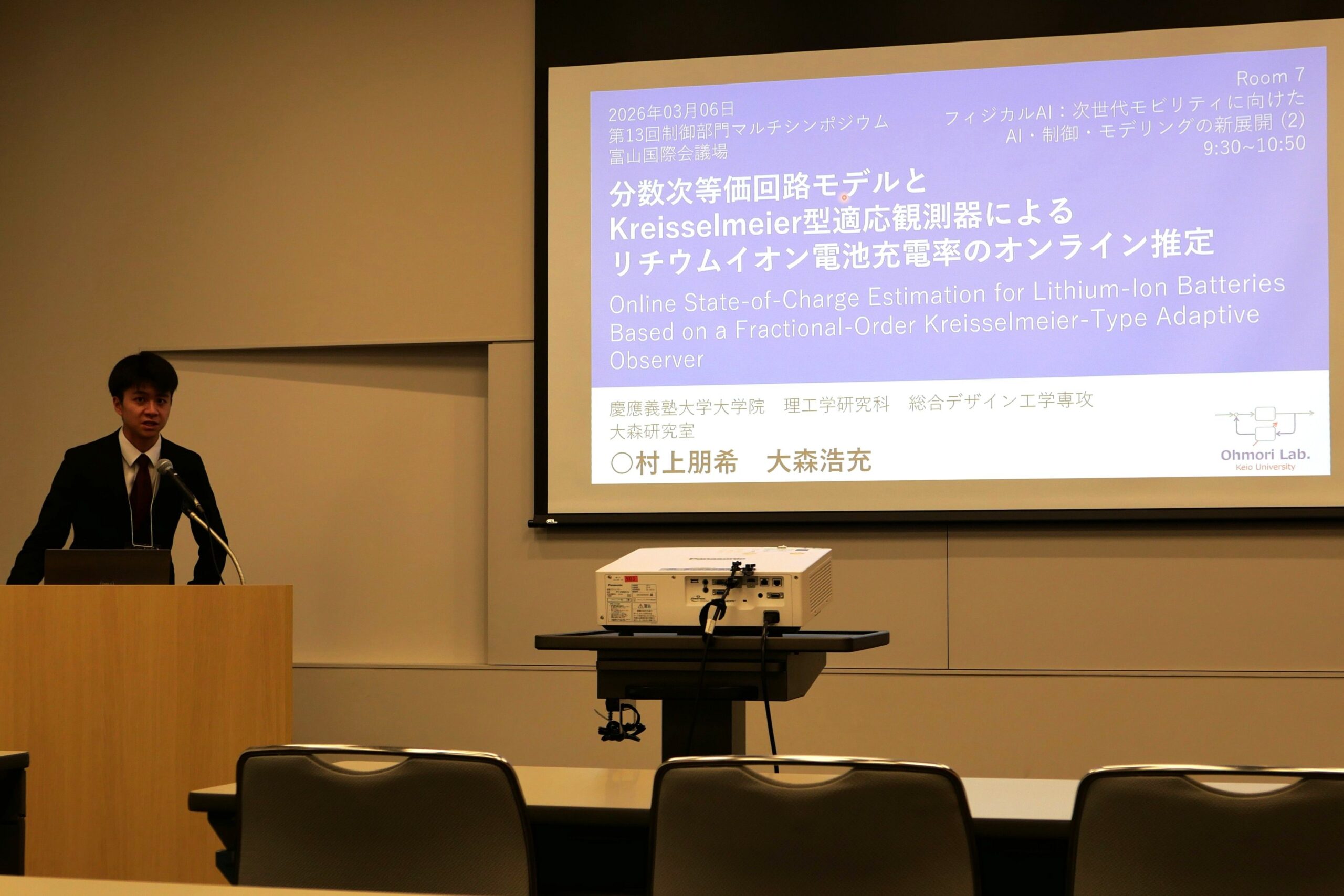・ 3/6 に NV輪講のメンバーである村上朋希君(慶大 大森研)が「分数次等価回路モデルとKreisselmeier型適応観測器によるリチウムイオン電池充電率のオンライン推定」(村上,大森)を発表しました。